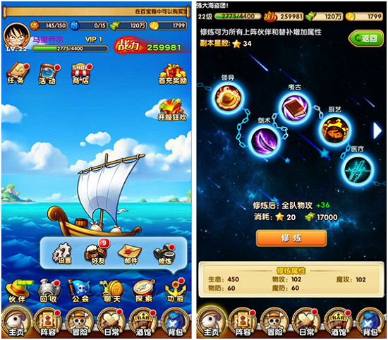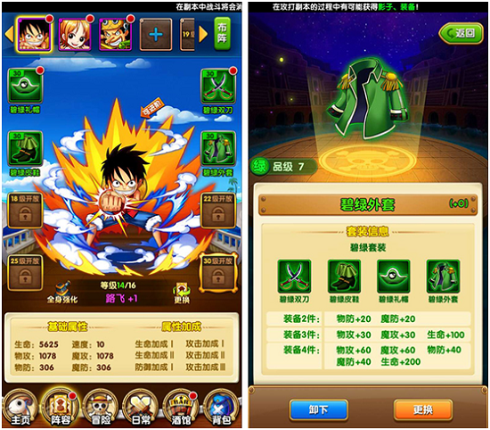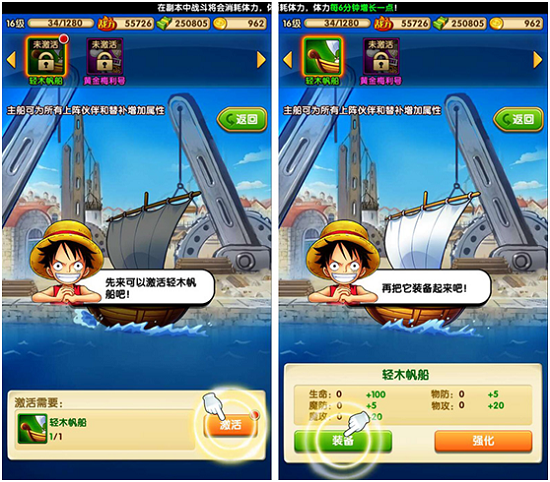 顺着进程,基本上打完副本【糖汁村】就可以达到16级了。到达16将会开启船坞系统,船坞通过消耗对应的道具激活,激活后可以装备新的船坞,船的样子也会随之发生变化,而且还有不少的属性加成。看着现在还未激活的黄金梅利号就眼馋不已了,想着自己的小船能够变成装修华丽的大船时里心里还有点小激动呢!