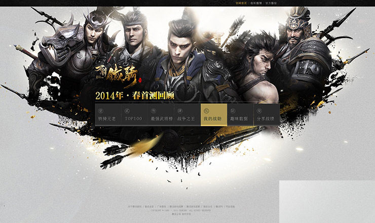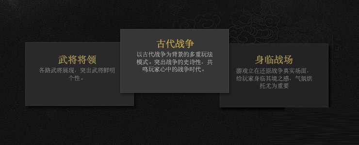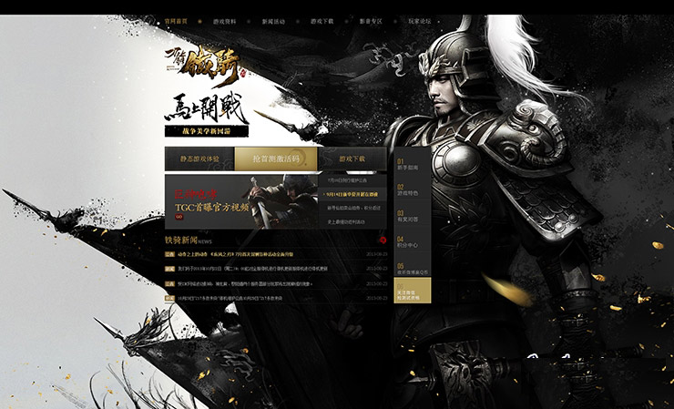 官网首页在设计中沿用黑金两色,2D黑金元素配合3D武将,营造出置身战场的意境。厚重铠甲和反复元素的背景前的是简单纯粹的UI让用户在各种视觉表现中也不会丢失交互重点。