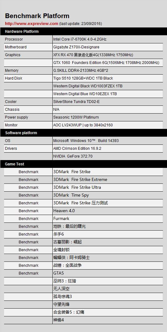 测试平台基于4.0GHz的Core i7-6700K处理器,DDR4-3200 4GB*2内存和海韵Platinum 1200W电源。显卡方面则是分别选出NVIDIA GeForce GTX 1060 Funders Edition以及XFX Radeon RX 470黑狼进化版作为测试对象,两者外接供电接口都是6Pin。