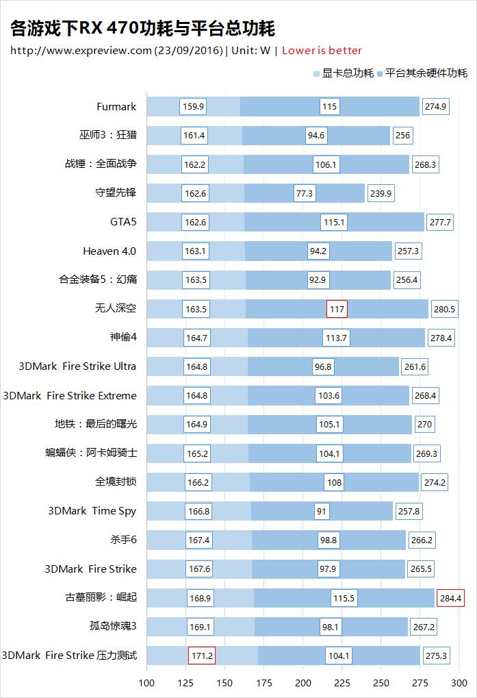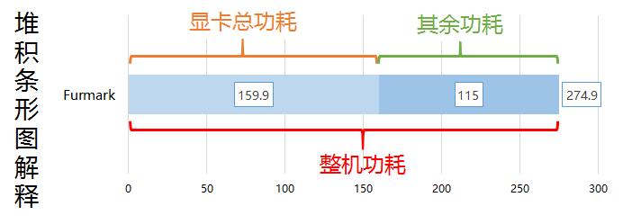 堆积条形图按照显卡功耗测试结果从小到大升序排列。如下图所示,以Furmark为例,左边第一数据是显卡的PCI-E插槽供电以及外接供电接口相加的总功耗159.9瓦,中间数据是平台其余配件的功耗总和115瓦,最后一个数据则是整机总功耗274.9瓦。