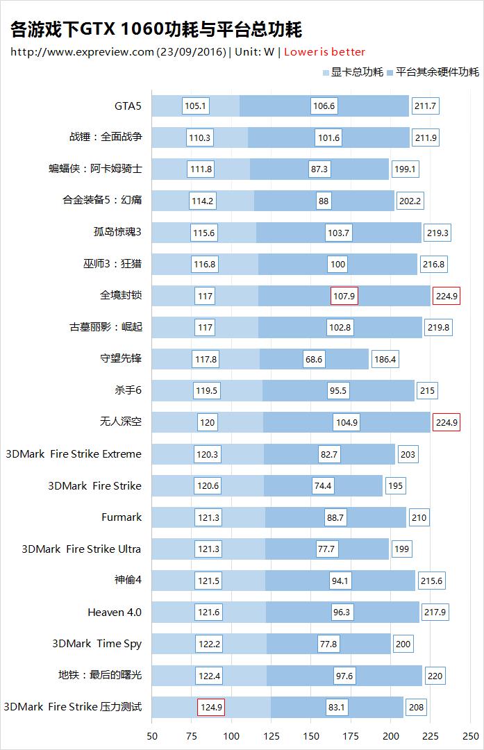 可以发现3DMark Fire Strike压力测试中得到了GeForce GTX 1060的最大功耗为124.9瓦,但整机平台最大功耗则是在《全境封锁》以及《无人深空》下获得,为224.9瓦。初步断定选用3DMark Fire Strike压力测试是能让显卡功耗达到比较高的水平,但弊端在于不能得出整机平台的最大功耗。