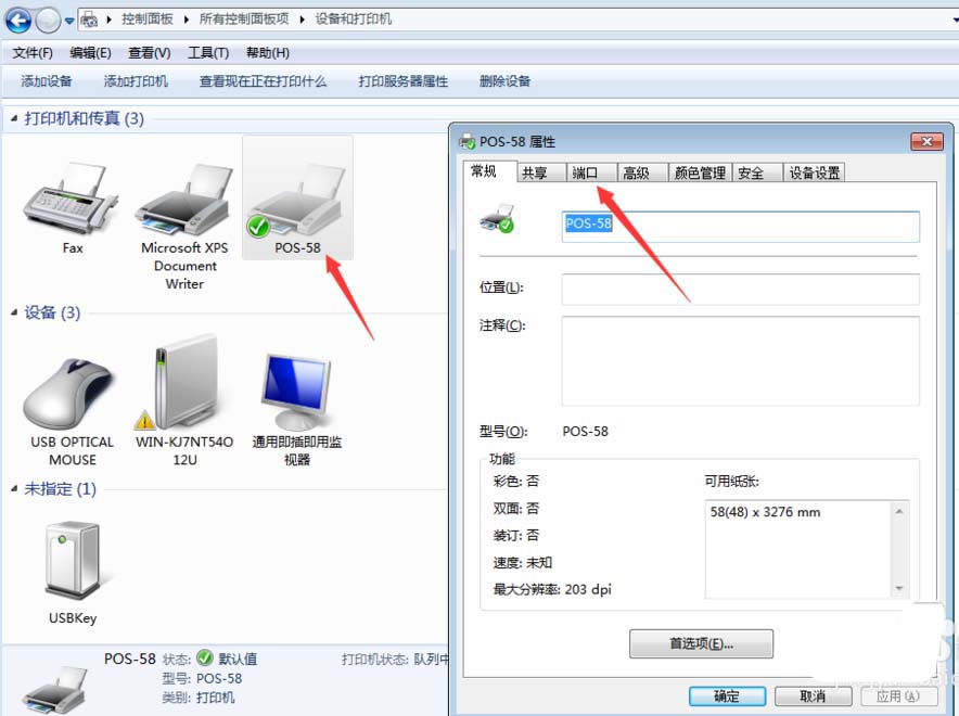7、在属性端口选择usb001 、usb002,哪个没有打对勾就打上那个。